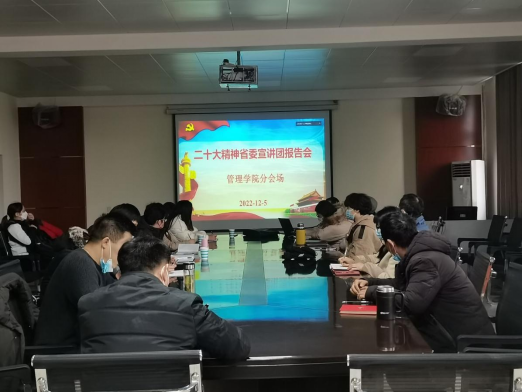 12月5日上午学习贯彻党的二十大精神宣讲报告会在kaiyun官方登录入口大礼堂举行,省委宣讲团成员、江西省发展和改革委员会党组书记、主任张和平同志作宣讲报告,管理学院积极组织分会场,学院党政领导班子成员、各科室负责人、学生党支部书记参会。
