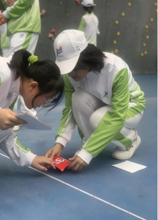 冷襄婷和小伙伴们在南区田径馆按照横竖间隔2.5米张贴1300个点位