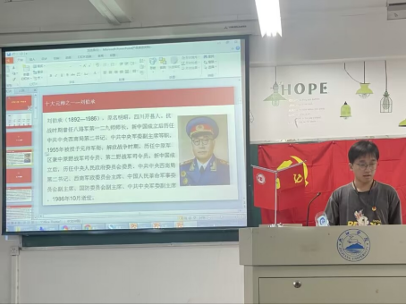 杨斌文同学在学习了左权同志的事迹后,也向大家分享了红色人物刘伯承。刘伯承,抗战时期曾任八路军第一二九师师长,1955年被授予元帅军衔。他为公为民,敢于拼搏,坚定理想信念,不忘初心。刘伯承始终胸怀“大丈夫当仗剑拯民于水火”的壮志。在丰都战役中,他身先士卒,不幸一颗子弹从他右太阳穴射入。为了保护脑神经拒绝使用麻醉剂,用坚强的意志力战胜了手术的剧痛,被誉为“军神”。他从军数年,向来不顾个人性命,家中更无私蓄,遇敌时便可奋不顾身,为的是救国救民。