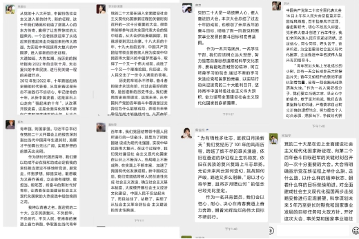 习近平总书记的报告深入人心,带领同学们回顾历史,展望未来,激励同学们坚定理想信念、不畏困难、直面挑战,在全面建设社会主义现代化国家新征程中不忘初心、砥砺前行。同学们牢记习近平总书记的讲话,认真思考,在直播结束后心潮澎湃,纷纷在线上发表心得感悟,并自发将二十大报告推文分享至朋友圈。
