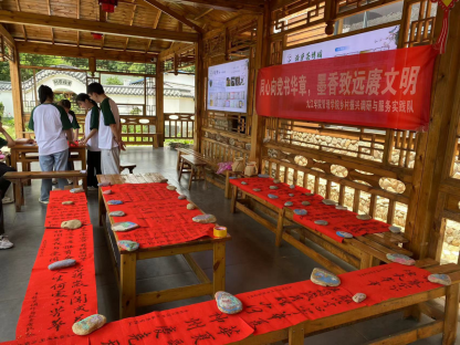 翰墨飘香书党史,红色书法润人心。为推进红色文化走进乡村,助力乡村文化振兴,实践队在光明村开展红色书法展,实践队员们亲自书写经典红色诗歌,一同感受书法魅力,体悟红色文化,传承红色基因。翰墨飘香间,一张张红色书法在墨香茶廊中展现,吸引大批群众到此观光游览。活动后,实践队员走进光明村落,入户赠送红色书法作品,同村民共同体悟红色文化,赓续红色血脉,为乡村文化振兴贡献青春力量。