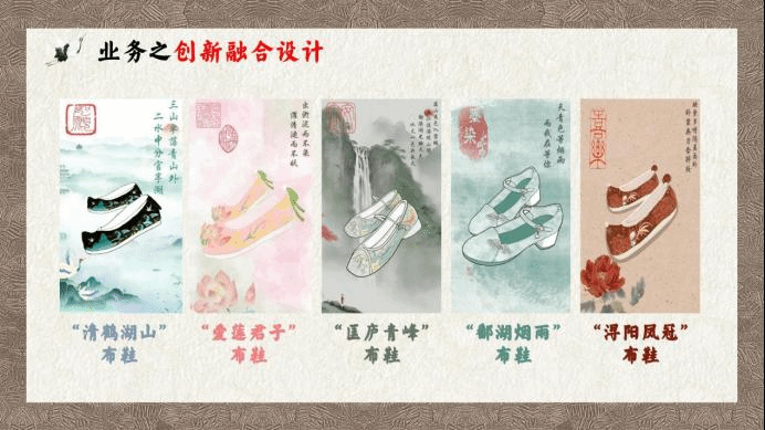为解决布鞋款式单一的难题,团队依托于江西大江大湖、名山名人的特点,融入庐山,鄱阳湖,爱莲说等元素,设计出“浔阳凤冠”、“匡庐青峰”、“鄱湖烟雨”、“爱莲君子”、“青鹤湖山”等多款布鞋,助力赣鄱赓续文脉,守正创新。指导老师王晴认为,“我们要立足国潮文化,结合历史文献,向消费者呈现布鞋精致华美又舒适耐穿的内涵。”