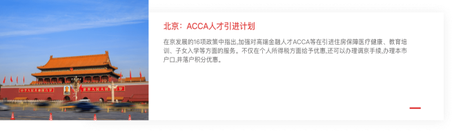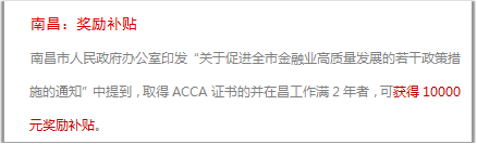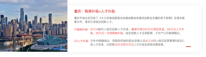 ACCA 会员资格在国内广泛被认可,多地政府都将 ACCA 持证人员列入稀缺性 高端财会人才,包括北京、上海、广州、深圳、成都、西安、重庆、天津、厦门、南昌等在内的各大城市相继出台各项优待政策,ACCA 持证人可享受诸如积分落户、 个税减免、专项奖金、置业补贴、子女入学等各项优待。部分城市 ACCA 人才优待政策如下: