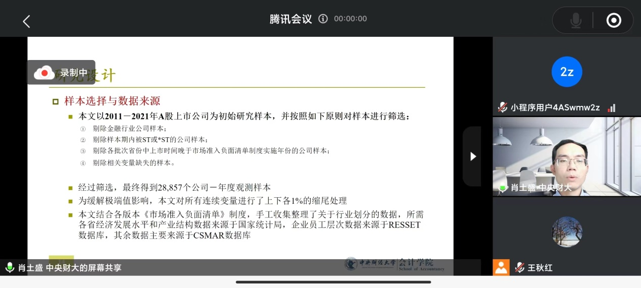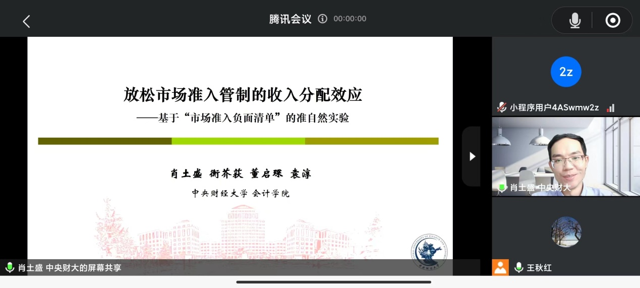 9月20日下午,为了营造学术氛围,拓展学术领域,提高教师科学研究水平,开云kaiyun网站特邀请中央财经大学肖土盛博士,通过线上腾讯会议作了一场名为《放松市场准入管制的收入分配效应——基于“市场准入负面清单”的准自然实验》的学术讲座。讲座由王秋红副院长主持,开云kaiyun网站的教授、博士及科研爱好者参加。